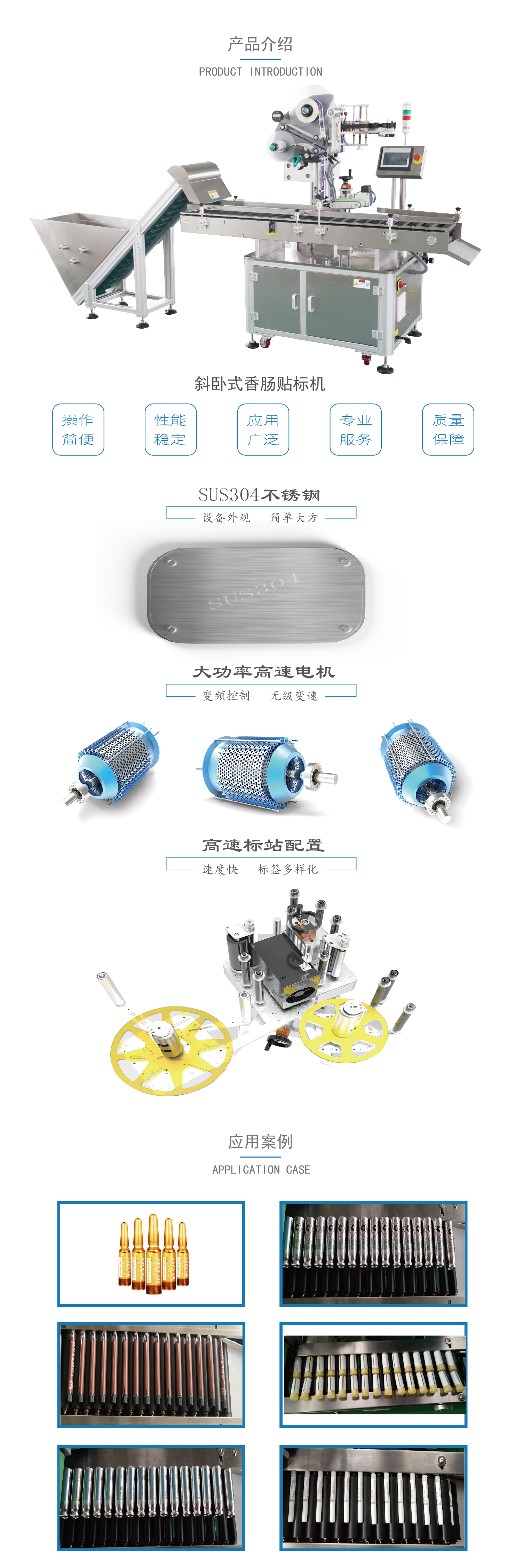 適用以下行業產品的全周或者半周的自動化貼標要求:制藥行業類,如安瓿瓶、口服液、采血管等產品;文具用品類,如筆桿、固體膠、漿糊筆等產品;化妝品行業類,如口紅、眉筆等產品;肉制品行業類,如火腿腸等圓形產品。 可選用工業視覺檢測物體的標簽是否有漏貼,對貼標物體的收集、打印三期等功能滿足; 本機型主要的材質為符合國際標準的SUS304不銹鋼和進口鋁合金材質,鋁合金的表面經過雙層陽極氧化處理,不生銹、不變形。